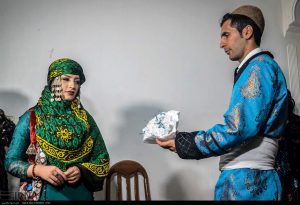 Nekada su porodice birale momka ili djevojku i međusobno ih upoznavale, dok se danas mladi uglavnom sami upoznaju, a onda se njihove porodice kroz prosidbu bliže upoznaju. Nakon što se porodice dogovore, slijedi baleburun. Na ovoj ceremoniji se okupljaju stariji članovi porodica i zajednički odlučuju o mirazu (mehru) mlade, kao i o datumu zaruka i svadbe. Ove odluke se zatim zapisuju i potpisuju. Također, porodica mladoženje tom prilikom daruje mladu prstenom, materijalom za čador 7 , svečanom odjećom, mahramom ili šalom, buketom cvijeća i slatkišima. Treća ceremonija je vjenčanje. Ono može biti održano u kući mladinih roditelja ili u matičnom uredu. Tokom ovog obreda vrši se šerijatsko vjenčanje, mladenci postaju mahrem jedno drugom, postaju muž i žena u šerijatskom i pravnom smislu. Najvažniji dio ove ceremonije jeste sofre-ye aghd (svadbena sofra), koja sadrži različite simbolične predmete: Kur’an, ogledalo, par svijećnjaka, med, jaja, orasi, badem, lješnjak, kovanice, esfand 8 , cvijeće, kristalni šećer sa šafranom i hljeb i sir. Jedan od posebnih rituala tokom vjenčanja jeste trljanje šećernih glavica. Nekoliko mladih žena drži izvezenu tkaninu iznad glava mladenaca, dok jedna od njih trlja dvije ukrašene šećerne glavice jednu o drugu, čime simbolično priziva sreću i slatki život za mladence.